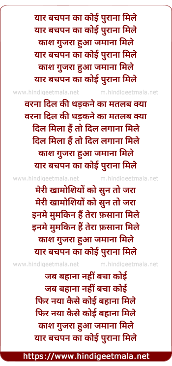 Lyrics of Yaar Bachpan Ka - यार बचपन का कोई पुराना मिले