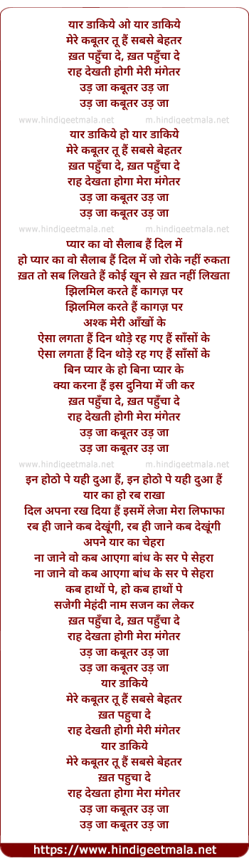 Lyrics of Yaar Dakiye Mere Kabutar Tu Hai Sabse Behatar - यार डाकिये ओ यार डाकिये मेरे कबूतर तू है सबसे बेहतर