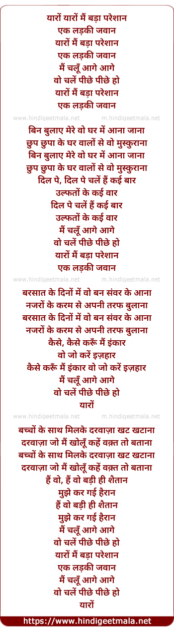 Lyrics of Yaaro - यारों यारों मैं बड़ा परेशान