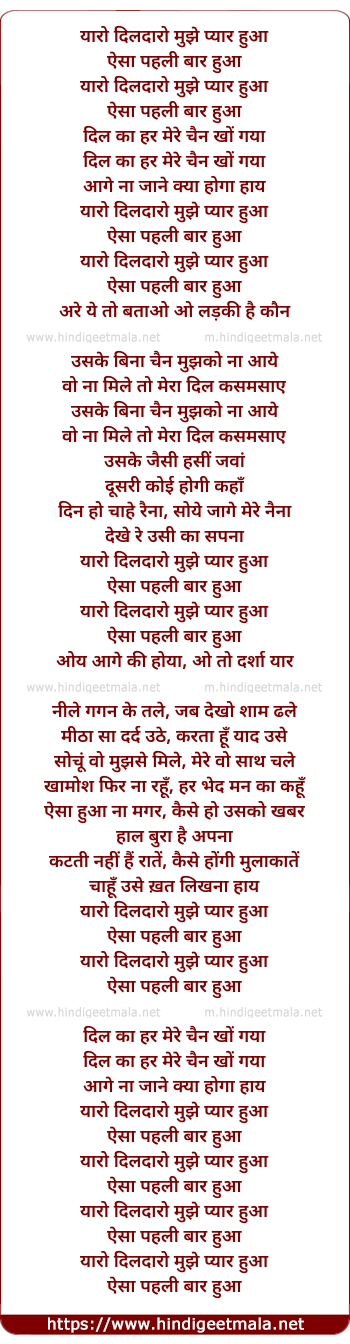 Lyrics of Yaaro Dildaaro Mujhe Pyar Hua - यारो दिलदारो मुझे प्यार हुआ