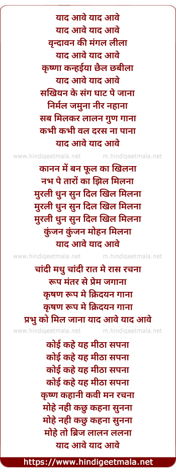 Lyrics of Yad Aave Vrindavan Ki Mangal Leela - याद आवे याद आवे