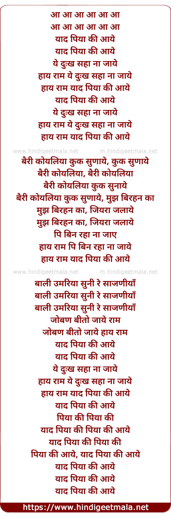 Lyrics of Yad Piya Ki Aaye - आ आ आ आ आ आ