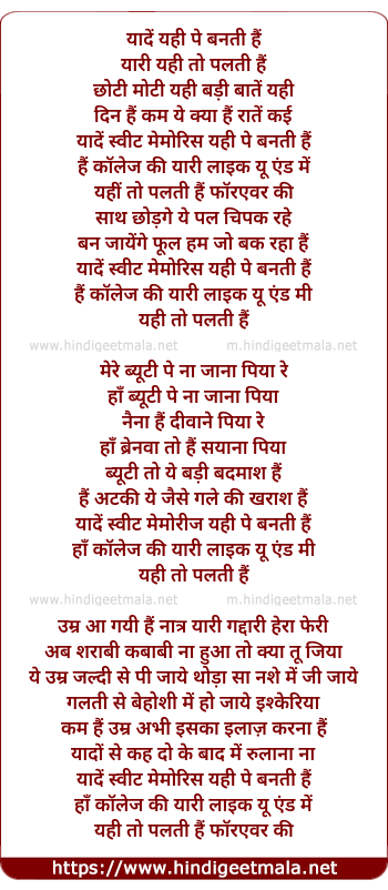 Lyrics of Yadein Yahin Pe Banti Hai - यादें यही पे बनती हैं