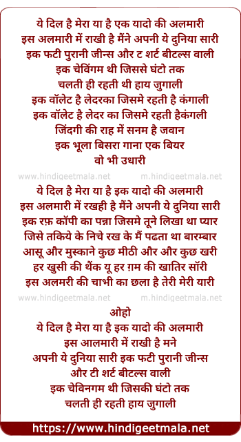 Lyrics of Yadon Ki Almari - यादों की अलमारी
