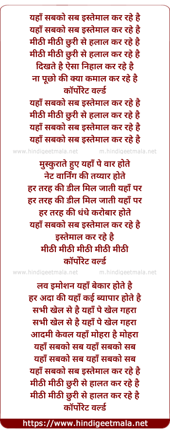 Lyrics of Yaha Sabko Sab Istemal Kar Rahe Hai (Corporate World) - यहाँ सबको सब इस्तेमाल कर रहे है