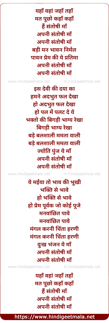 Film CastKanan Kaushal, Anita Guha, Ashish Kumar, Bharat Bhushan, Trilok Kapoor, Rajni Bala, Rajan Haksar, Leela Mishra, B M Vyas, Dilip DuttSingerMahendra Kapoor, Manna Dey, Pradeep, Usha MangeshkarLyricistPradeepMusic ByC ArjunDirectorVijay SharmaProducerSatram RoharaExternal LinksJai Santoshi Maa at IMDB Jai Santoshi Maa at WikipediaYouTubeJai Santoshi Maa at YT Jai Santoshi Maa at YT(2)