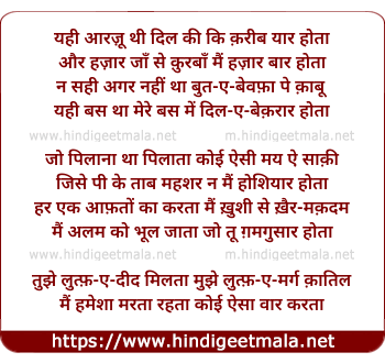 Lyrics of Yahee Aaraju Thee Dil Kee - यही आरज़ू थी दिल की कि क़रीब यार होता