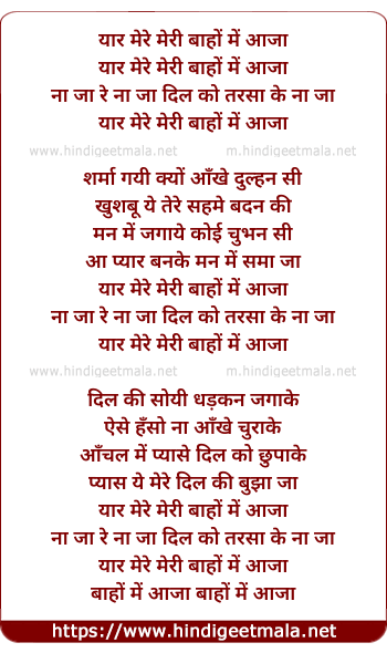Lyrics of Yar Mere Meri Bahon Me Aaja Na Ja - यार मेरे मेरी बाहों में आजा