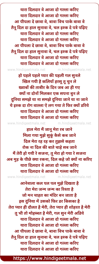Lyrics of Yara Dildara Ve Aja - यारा दिलदार वे आजा