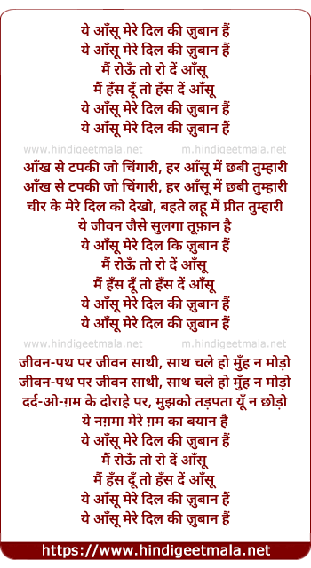 Lyrics of Ye Aansu Mere Dil Ki Zubaan Hain - ये आँसू मेरे दिल की ज़ुबान हैं