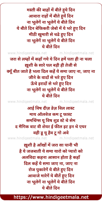 Lyrics of Ye Beete Din (Acoustic Version) - मस्ती की बाहों में बीते हुये दिन