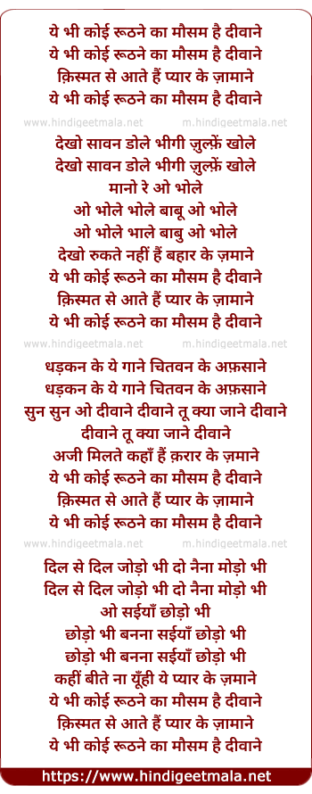 Lyrics of Ye Bhi Koi Ruthne Ka Mausam Hai - ये भी कोई रूठने का मौसम है दीवाने