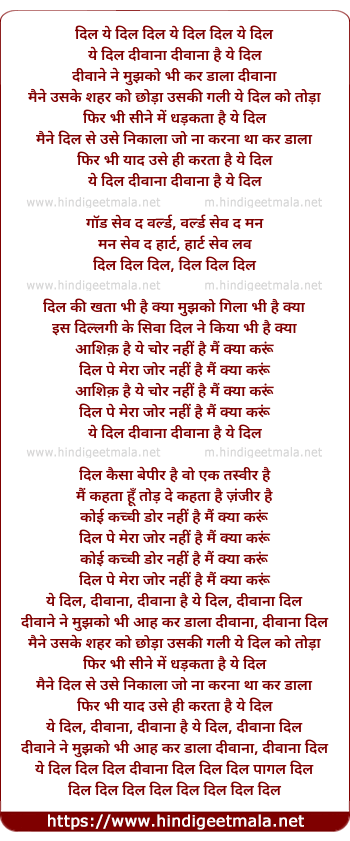 Lyrics of Ye Dil Divaana Divaana Hai Ye Dil - ये दिल दीवाना दीवाना है ये दिल
