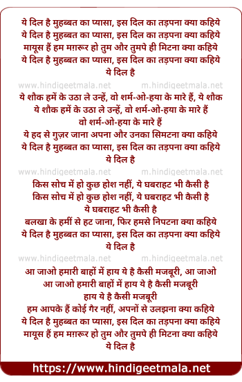 Lyrics of Ye Dil Hai Mohabbat Ka Pyaasa, Is Dil Ka Tadapna Kya Kahiye - ये दिल है मुहब्बत का प्यासा, इस दिल का तड़पना क्या कहिये