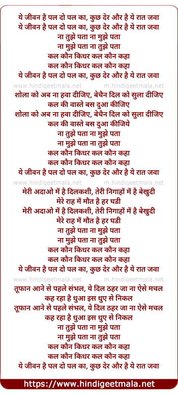 Lyrics of Ye Jiwan Hai Pal Do Pal Ka - ये जीवन है पल दो पल का