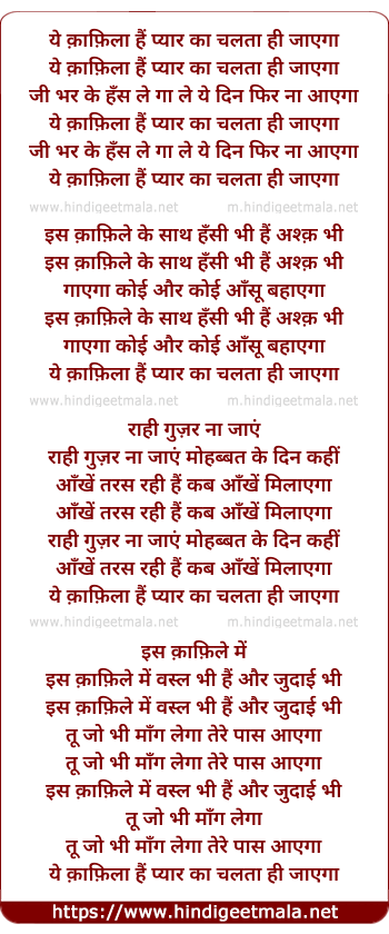 Lyrics of Ye Kaafila Hai Pyar Ka - ये क़ाफ़िला हैं प्यार का चलता ही जाएगा