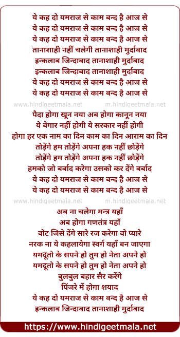 Lyrics of Ye Kah Do Yamraj Se Kaam Band Hai Aaj Se - ये कह दो यमराज से काम बन्द है आज से