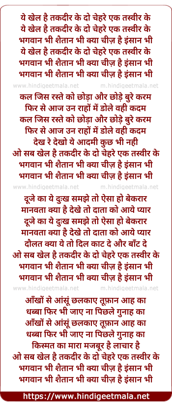 Lyrics of Ye Khel Hai Takdir Ke Do Chehare Ik Tasvir Ke - ये खेल है तकदीर के दो चेहरे एक तस्वीर के