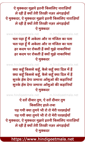 Lyrics of Aye Muqaddar Mujhpe Itni - ऐ मुक्कदर मुझपे इतनी