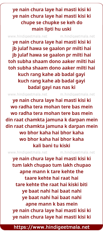 Lyrics of Ye Nain Chura Laye Hai Masti Kisi Ki