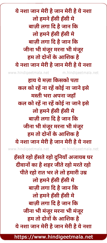 Lyrics of Ye Nasha Jaan Meri Hai - ये नशा जान मेरी है
