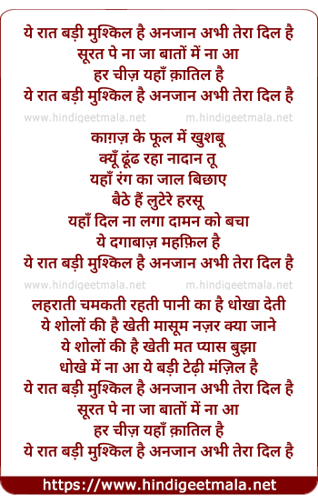 Lyrics of Ye Raah Badi Mushkil Hai Anjaan Abhi Tera Dil Hai - ये रात बड़ी मुश्किल है अनजान अभी तेरा दिल है