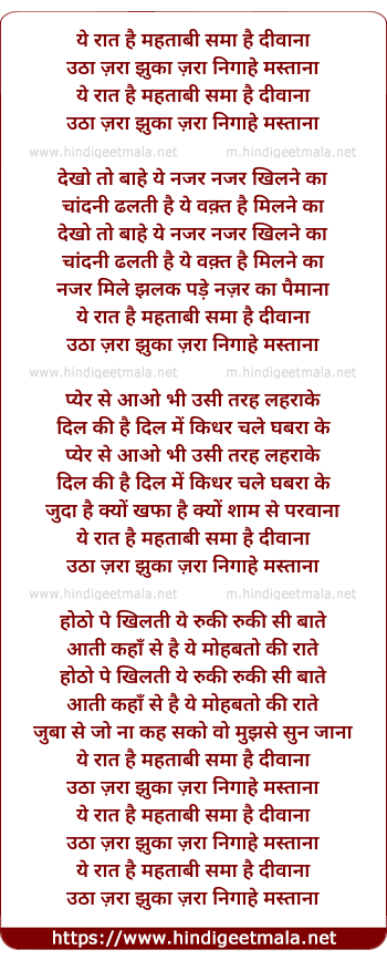 Lyrics of Ye Raat Hai Mahtabi Sama Hai Diwana - ये रात है महताबी समा है दीवाना