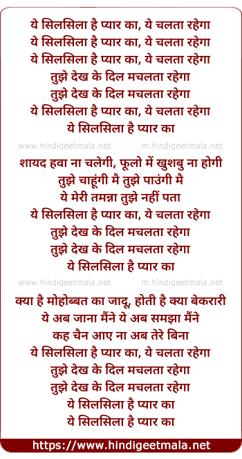 Lyrics of Ye Silsila Hai Pyar Ka Ye Chalta Rahega - ये सिलसिला है प्यार का ये चलता रहेगा
