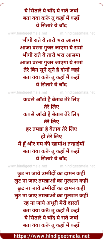 Lyrics of Ye Sitare Ye Chand Ye Raate Ye Jawaa - ये सितारे ये चाँद ये राते जवां