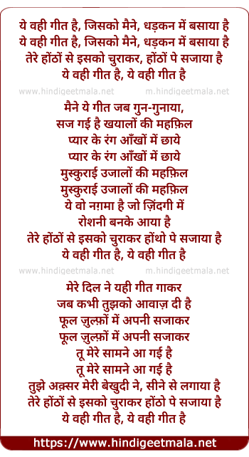 Lyrics of Ye Wohi Geet Hai, Jisko Maine, Dhadakan Me Basaya Hai - ये वही गीत है, जिसको मैने, धड़कन में बसाया है