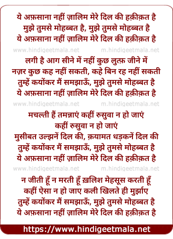 Lyrics of Yeh Afsana Nahee Jalim Mere Dil Kee Hakikat Hai - ये अफ़साना नहीं ज़ालिम मेरे दिल की हक़ीक़त है