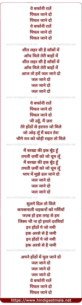 Lyrics of Yeh Barfani Raaten Pighal Jane Do (Female) - ये बर्फानी रातें पिघल जाने दो