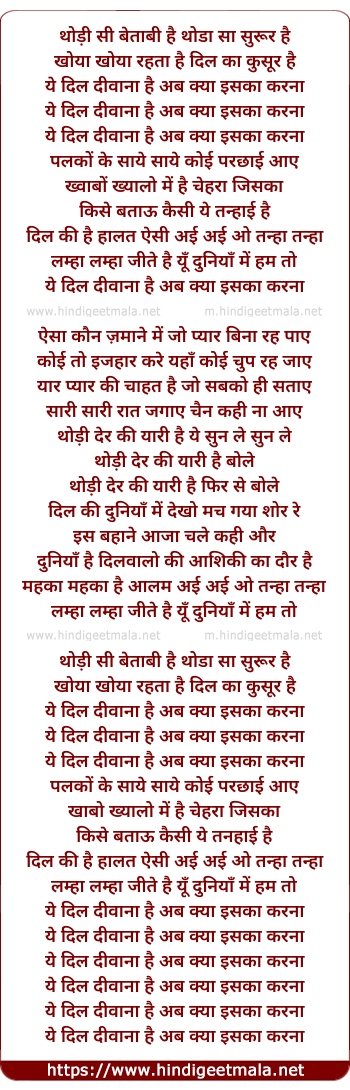Lyrics of Yeh Dil Deewana Hai - थोड़ी सी बेताबी है थोडा सा सुरूर है