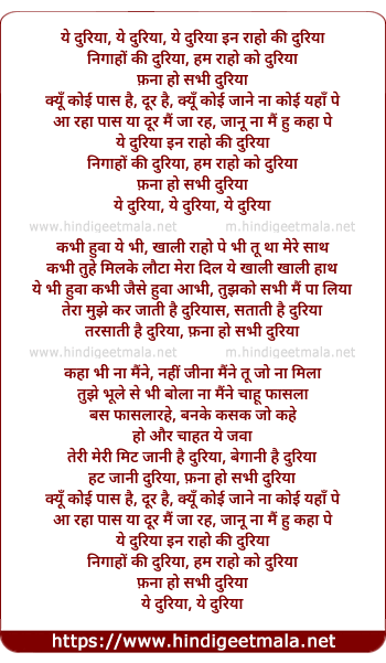 Lyrics of Ye Duriya In Raaho Ki Duriya - ये दूरियाँ इन राहो की दूरियाँ