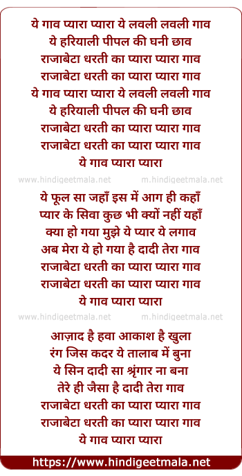 Lyrics of Ye Gaon Pyara Pyara, Ye Lovely Lovely Gaon - ये गाँव प्यारा प्यारा, ये लवली लवली गाँव