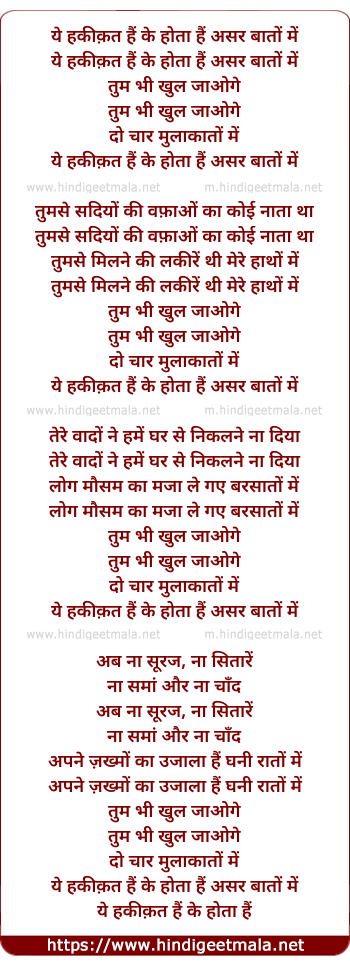 Lyrics of Yeh Haqeeqat Hai - ये हकीक़त हैं के होता हैं असर बातों में