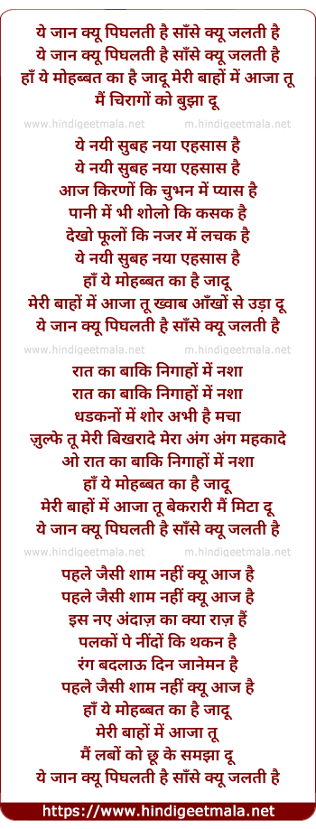 Lyrics of Ye Jaan Kyu Pighalti Hain - ये जान क्यू पिघलती है