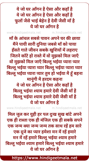 Lyrics of Ye Jo Ghar Aangan Hai Aisa Aur Kaha Hai - ये जो घर आँगन है ऐसा और कहाँ है