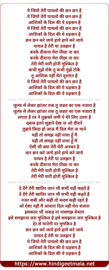 Lyrics of Yeh Jo Teri Payalo Ki Chhan Chhan Hai - ये जो तेरी पायलो की छन छन है