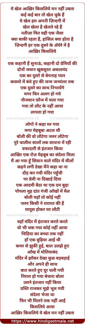 Lyrics of Yeh Khel Aakhir Kisliye - ये खेल आख़िर किसलिये मन नहीं उबता