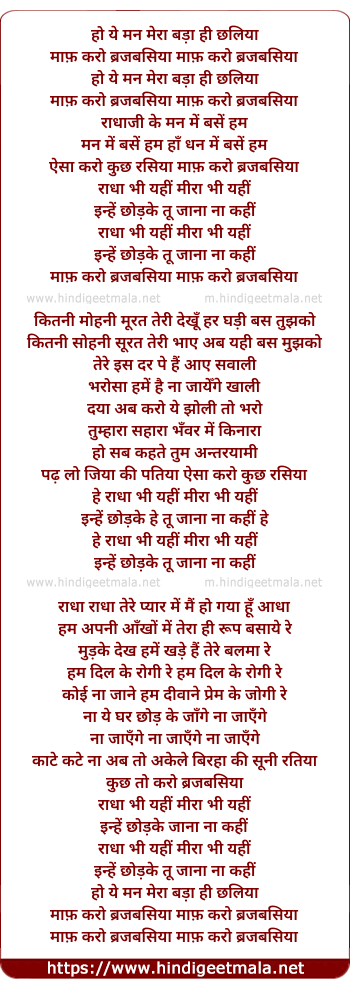 Lyrics of Yeh Mann Mera Bada Hi Chaliyan - ये मन मेरा बड़ा ही छलिया