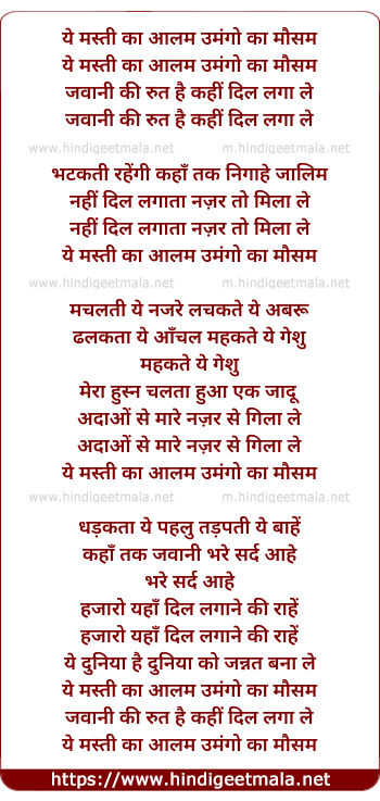 Lyrics of Yeh Masti Ka Aalam Umango - ये मस्ती का आलम उमंगो