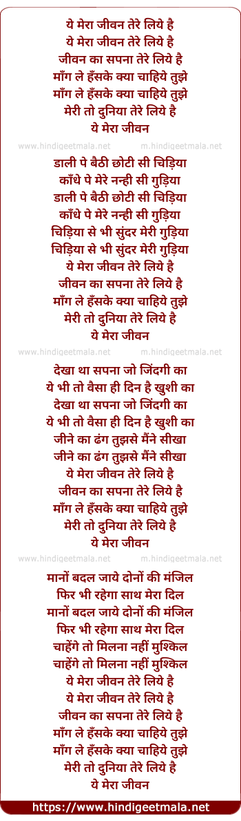 Lyrics of Ye Mera Jivan Tere Liye Hai, Jiwan Ka Sapna Tere Liye Hai (Slow Version) - ये मेरा जीवन तेरे लिये है, जीवन का सपना तेरे लिए है