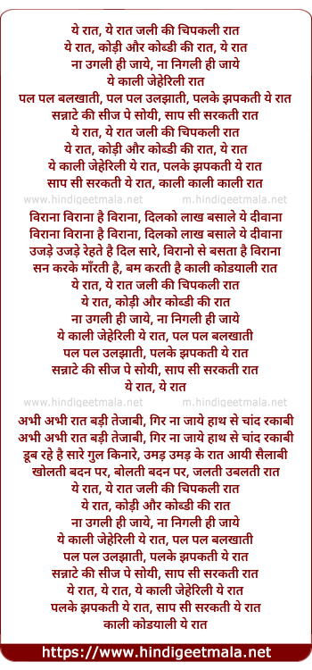 Lyrics of Yeh Rat Jali Ki Chipkali Rat - ये रात जली की छिपकली रात