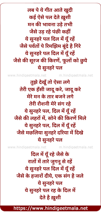 Lyrics of Yeh Sunehare Pal - लब पे ये गीत आते खुदी
