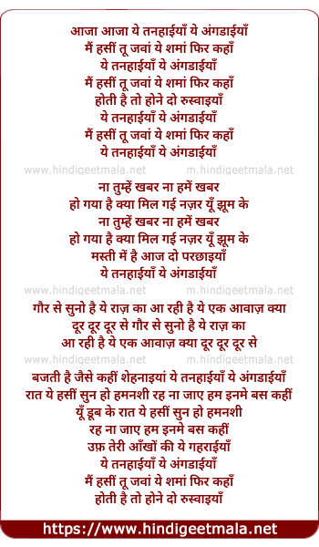 Lyrics of Yeh Tanhaiya, Yeh Angdaiya - ये तनहाईयाँ, ये अंगडाईयाँ