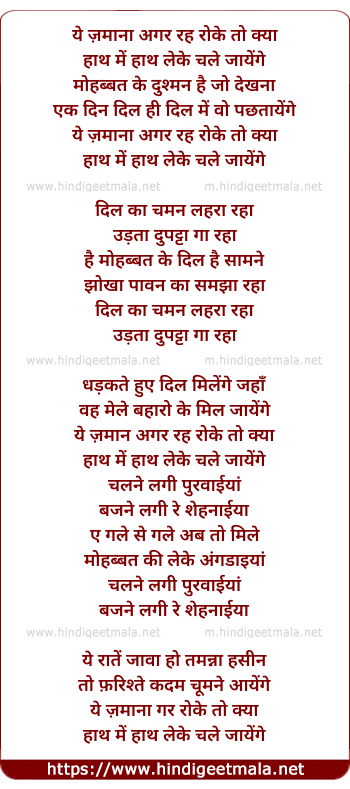 Lyrics of Ye Zamanaa Agar Raah Roke - ये ज़माना अगर राह रोके