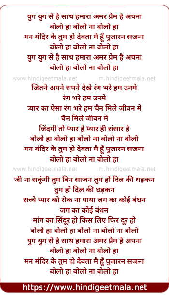 Lyrics of Yug Yug Se Hai Saath Hamara Amar Prem Hai Apna - युग युग से है साथ हमारा अमर प्रेम है अपना