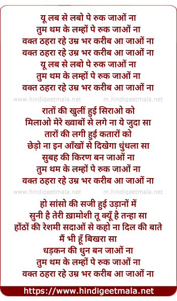 Lyrics of Yun Lab Se Labo Pe Likh Jao Na - यू लब से लबो पे रुक जाओं ना