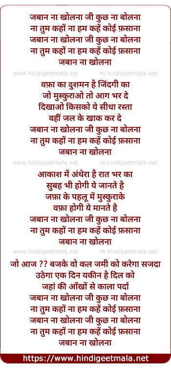 Lyrics of Zabaan Na Kholna, Ji Kuchh Na Bolna - जबान ना खोलना जी कुछ ना बोलना